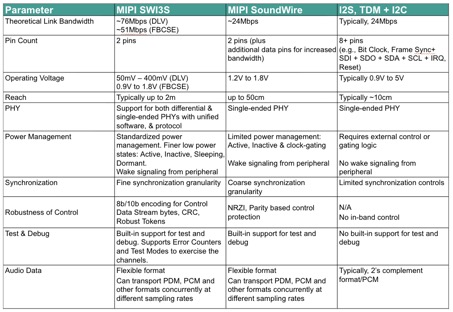 Table: Comparison of MIPI SWI3S and MIPI SoundWire with legacy interfaces