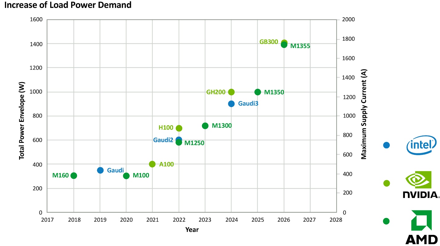 The shift from traditional CPU-centric architectures to GPUs and specialized accelerators is driving a continued surge in power demand. Modern AI servers now consume two to three times more power than traditional enterprise servers, with high-performance AI racks exceeding 50 kW per rack compared to 5-15 kW per rack in conventional data centers. GPUs alone can consume 300-700W per card. As AI workloads scale, next-generation data centers must implement advanced power distribution architectures, high-efficiency voltage regulators, and innovative cooling solutions to sustain operational efficiency and reliability.