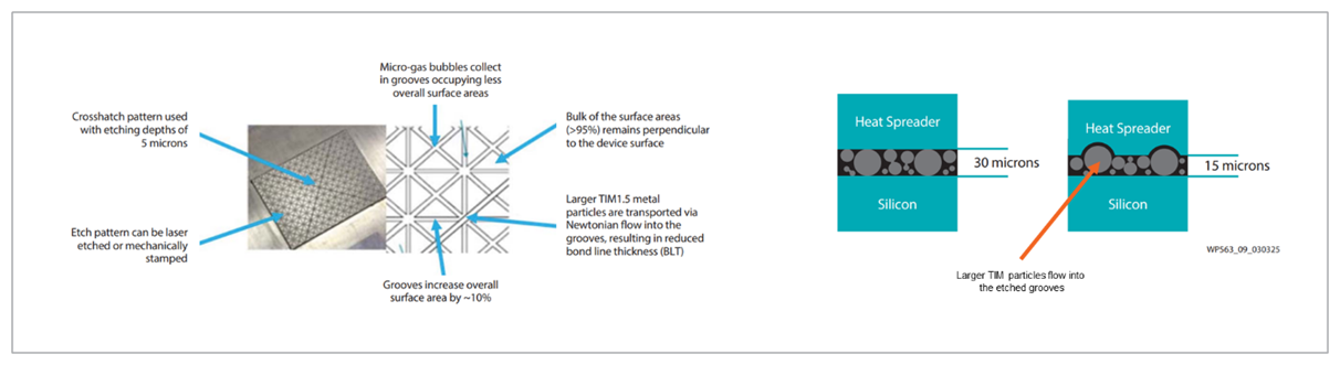 AMD also patented and pioneered the use of a novel heatsink etch pattern, intended primarily for use with lidless packages and Phase Change Material (PCM) TIMs. The concept behind this etch pattern is that machining the surface of the heatsink with a crosshatch reduces the thickness of the TIM layer between the die and the heatsink, resulting in improved thermal performance. AMD provides a mechanical design drawing for this pattern, and grants license to AMD customers to use these etch patterns exclusively with AMD FPGAs and SoCs.