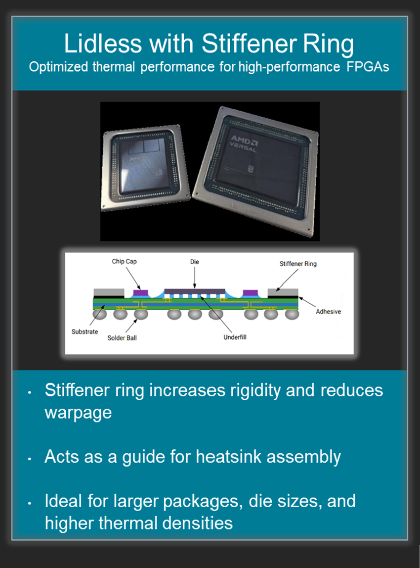 Chips, as with all things manufactured from materials that have differing coefficients of expansion, tend to warp over temperature extremes. Of course, the larger the die and package, the more pronounced warpage becomes. For cost-optimized FPGAs and adaptive SoCs, this does not present a problem because the die and package are comparatively small. However, for high-end FPGAs, the horizontal offset due to warpage is more pronounced, a problem compounded by the fact that high-end FPGA designs are often deployed in more demanding environments. With lidded packages, warpage is much less a problem as the lid acts to stiffen the overall assembly. AMD developed “lidless with stiffener ring” packages to emulate the structural benefits of the lid. In AMD lidless with stiffener ring packages, the periphery of the top of the package integrates a stainless steel “ring” (which is square / rectangular in shape) while leaving the top surface of the die exposed. The below images contrast the two package types: