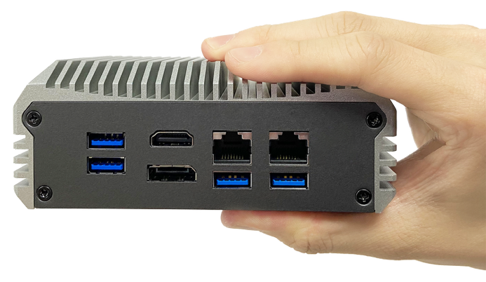 The ASB100-PI800 is an ultra-compact, palm-sized fanless edge computer engineered to deliver industrial-grade performance in extremely space-limited environments. Powered by the Intel® Atom x7433RE processor, it provides efficient real-time computing within a rugged 133 mm footprint. Designed for reliability and flexibility, it integrates dual 2.5GbE LAN, versatile USB and COM connectivity, TPM 2.0 security, dual display outputs, and dual M.2 expansion for wireless and storage scalability. Its silent, fanless architecture reduces maintenance while enabling stable operation in demanding edge environments such as automation, infrastructure monitoring, and embedded control systems.