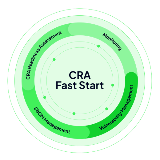The Cyber Resilience Act (CRA) introduces new obligations for manufacturers and operators of digital products. CRA Fast Start helps you enter compliance quickly and pragmatically – without lengthy ramp-up phases. If you’re still unsure where you stand, we start with a structured CRA assessment. We analyze your current setup, identify gaps, and define clear next steps toward compliance. Establish a solid foundation for CRA compliance by generating SBOMs on the fly and continuously identifying, prioritizing, and managing vulnerabilities across your products and components. Ongoing monitoring ensures transparency, early risk detection, and continuous compliance with CRA requirements throughout the product lifecycle.