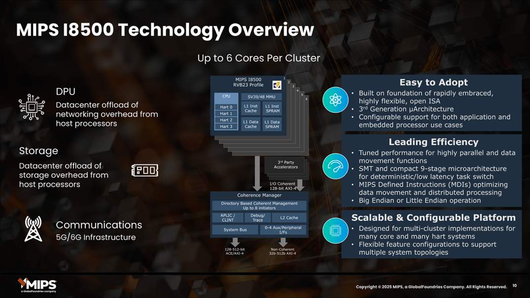 MIPS I8500 is a best-in-class match-action processor purpose-built for the Physical AI era—where sensing, thinking, acting, and communicating converge in real time. The MIPS I8500 features a scalable multithreaded architecture with 4 threads per core and support for multi-cluster deployments, enabling up to 24 threads per cluster. It delivers ultra-low-latency, deterministic data movement with integrated security, ideal for orchestrating packet flows across accelerators and enabling intelligent communication between compute blocks, humans, and networks.