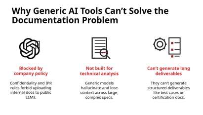 Generic AI solutions are not well-suited for this use case. In many cases, company policies don’t allow the use of generic AI solutions. But even if they are allowed, they are not built for technical analysis, and they cannot be trained on private data without risk of leaking confidential information. Furthermore, they are not designed to generate long deliverables like test cases or certification documents.