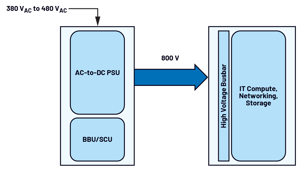 A new voltage distribution domain is defined to the rack—800 V. This is fed from a sidecar directly to the IT rack. Figure 3 shows the proposed architecture.