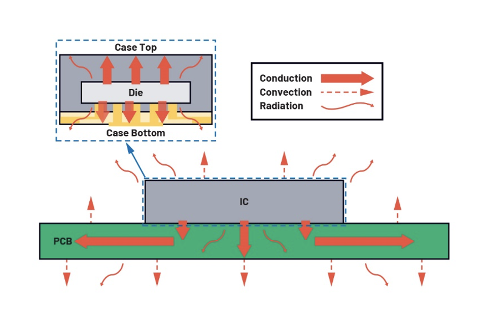 As illustrated in Figure 1, in IC applications, thermal conduction typically refers to dissipation within the IC package and through the PCB copper. Thermal convection generally occurs between the IC or PCB surface and the surrounding air. Thermal radiation is ubiquitous as it does not require a medium.