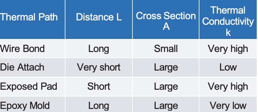 Thermal dissipation within the power IC occurs primarily through conduction, as described by Equation 2. Table 2 provides the thermal conductivity values for materials utilized in IC packaging2, which can be employed to assess thermal dissipation pathways in various packages. It is important to note that these values are also influenced by temperature.
