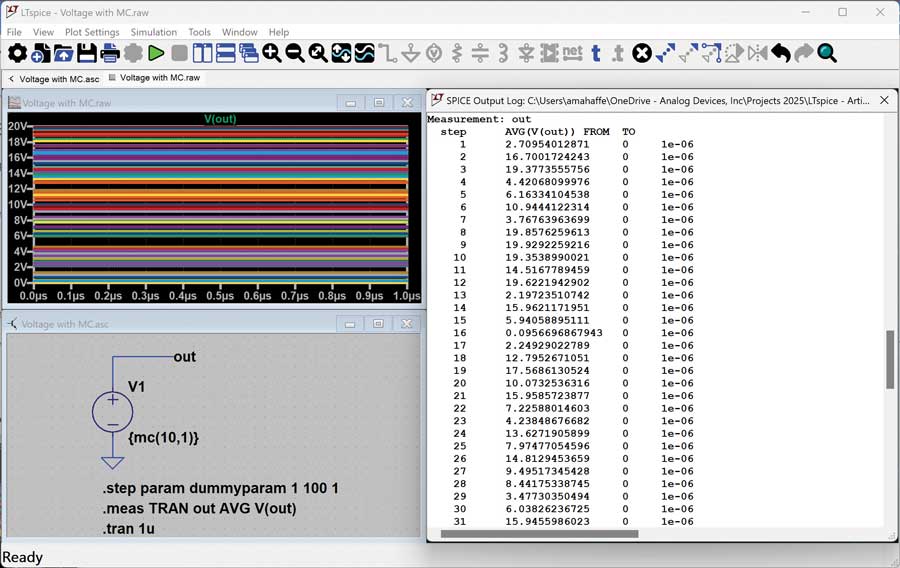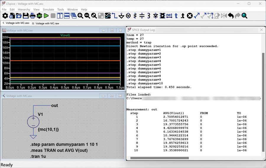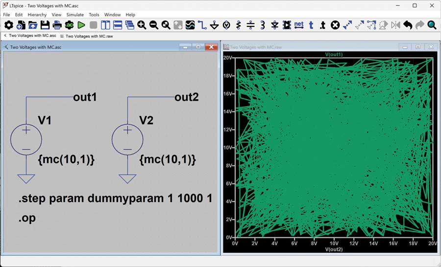 Observe what this mc() function is doing during each step iteration: Figure 2 shows a simpler example using a voltage source only. This example uses mc() to set the nominal voltage to 10 V and the tolerance at 100%, so a uniform distribution between 0 V and 20 V is expected. From the results in the waveform viewer and in the SPICE output log, notice that for 10 iterations, the voltage varies from 2.7 V to 19.92 V, and the distribution isn’t entirely uniform, but more iterations would help to ensure that these results are more statistically sound.