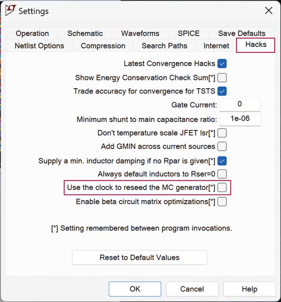 How does this relate to our LTspice simulation? If the goal is true run-to-run randomness in the simulation—meaning, values that change during each simulation—the Use the clock to reseed the MC generator option must be enabled in the Hacks section of the settings panel (see Figure 3).