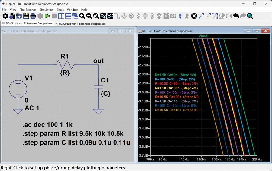 Figure 7 shows an example ensuring that the simulation hits all edges of the passive component tolerances while keeping the overall simulation time minimal. This example steps through three values of R1 and three values of C1, resulting in nine simulations, and it ensures that scenarios are covered for simultaneous minimums (or maximums) in the component values.