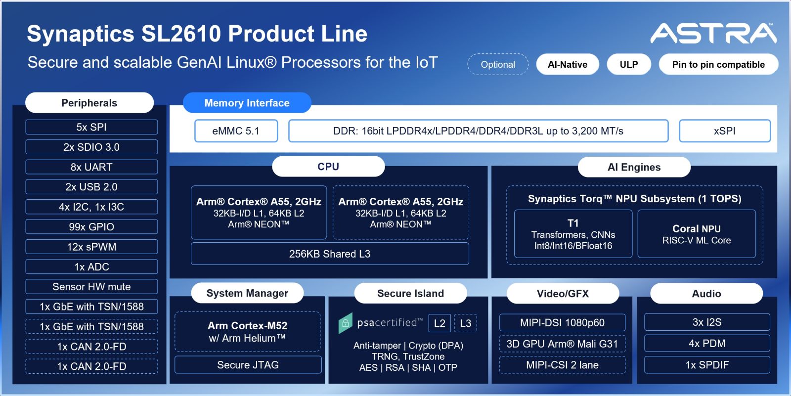 Beyond AI, the SL2610 is feature-rich: it supports dual CAN and dual Gigabit Ethernet, TSN networking, an integrated Cortex-M52 MCU for secure boot and power management, and PSA Level 2 and Level 3 security certification. It also includes advanced graphics, video, and display pipelines, making it suitable for both industrial and consumer designs.