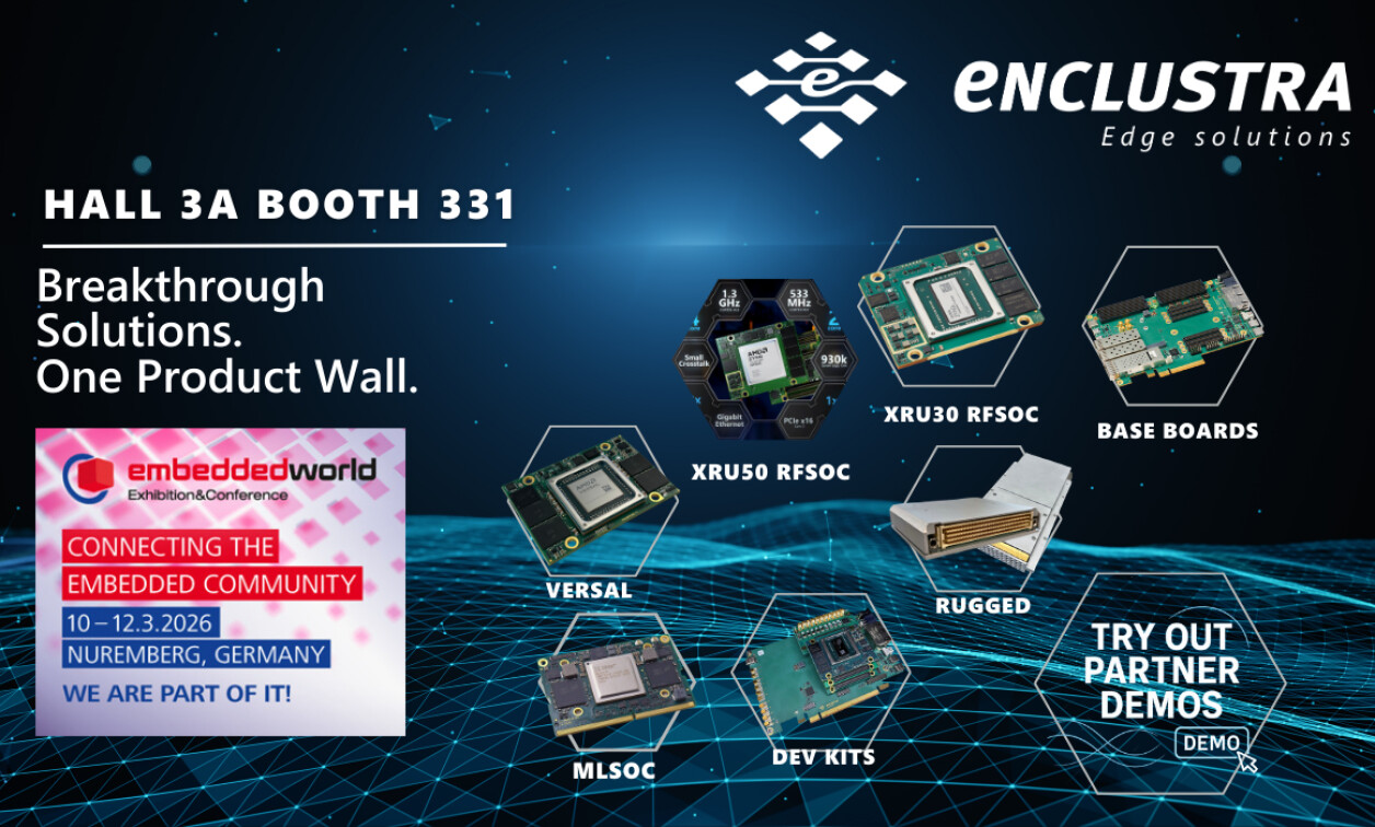 Enclustra will be located at Booth 3A-331 during this year's embedded world Germany where it will highlight its next-generation FPGA and SoC innovations. The booth will host an interactive Enclustra Product Wall, highlighting the latest Andromeda RFSoC and SoC modules, including the powerful Andromeda XRU50, the newly introduced XRU30 for scalable, high-performance RF applications, and the Andromeda XVE70 based on AMD Versal SoC for advanced edge AI and signal processing.