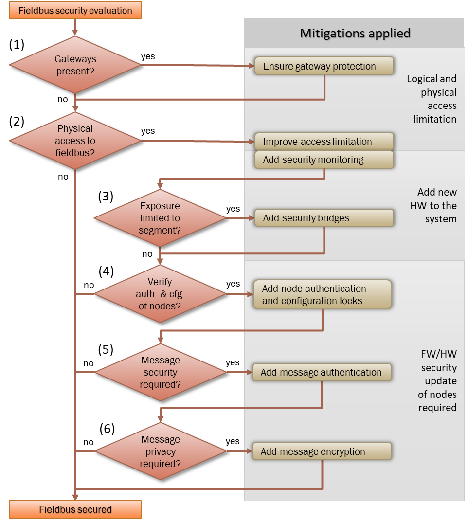 - If physical access to the fieldbus wiring or connectors is potentially possible for attackers, verify which further access restrictions can be implemented, and add a security monitoring and logging entity.