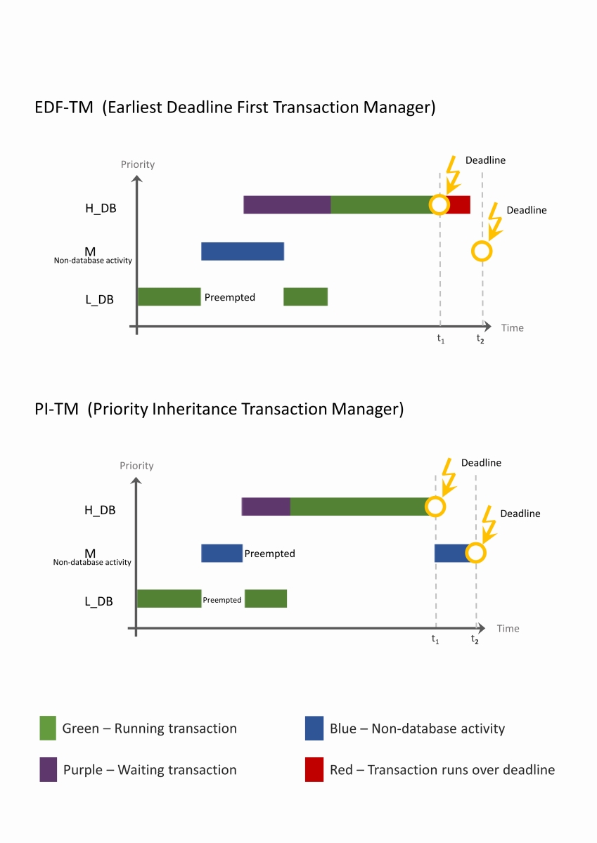 The EDF Transaction Manager, on the other hand, is a better fit for database-driven systems, where most of the activity involves database operations. It doesn’t directly schedule system tasks, but it works with the operating system’s synchronization mechanisms to put blocked threads into a WAIT state, take them out of scheduling, and make sure transactions run according to the priorities set by the transaction manager.
